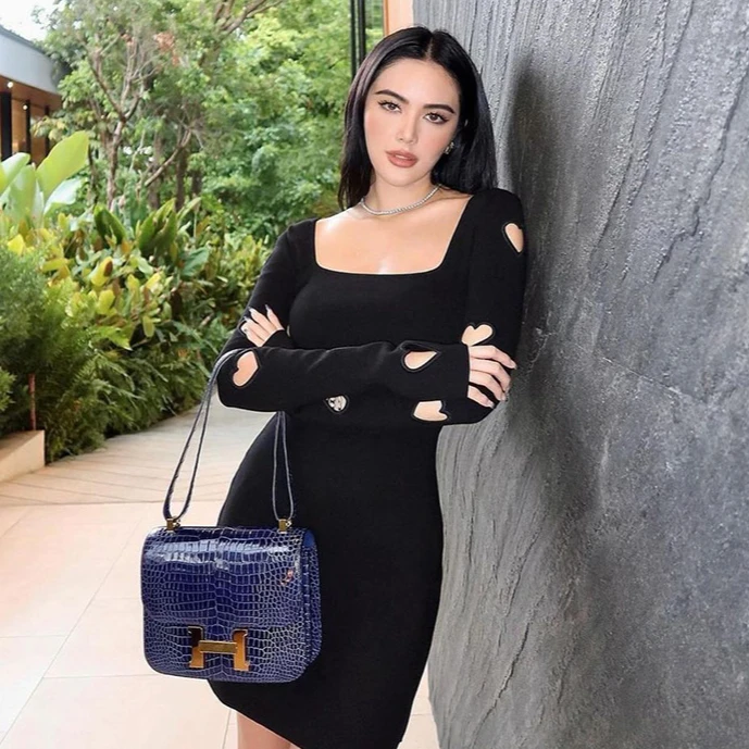 Knit Hollow Out Backless Mini Dress Women Square Collar Long Sleeve Slim Lace-Up Fashion Party Dress Ladies Knitwear Dress
